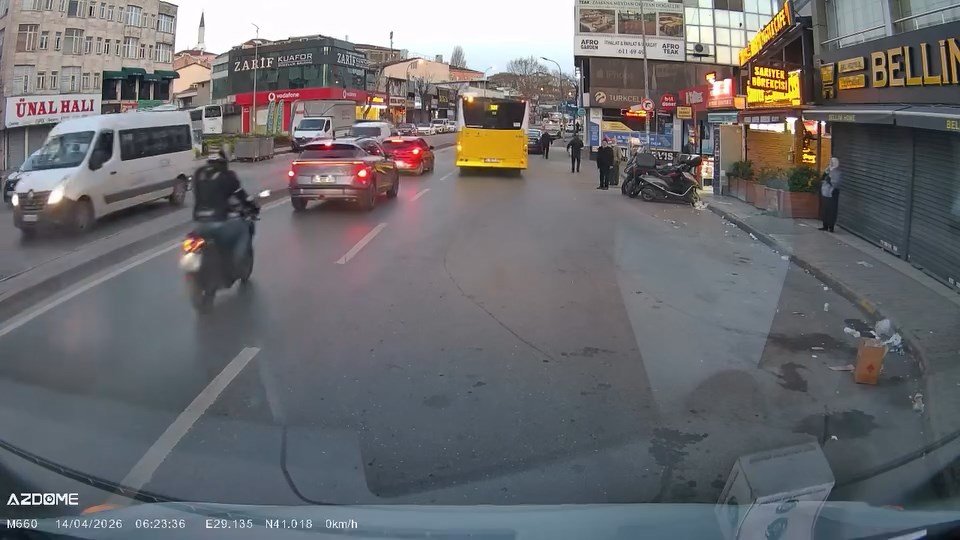 İstanbul Ümraniye’de motosiklet sürücüsü İETT otobüsüne yol vermek için duran otomobile arkadan çarptı. Motosiklet sürücüsünün çarpmanın şiddetiyle yere düştüğü anlar başka bir aracın kamerasına yansıdı.